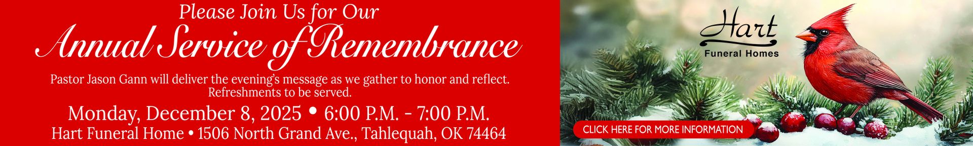 The loss of a loved one can leave you with a lot of unanswered questions, feelings of stress, and anxiety and grief that makes events difficult to handle. Hart Funeral Home - Tahlequah, will guide you through the aspects of the funeral service with compassion, dignity, and respect.